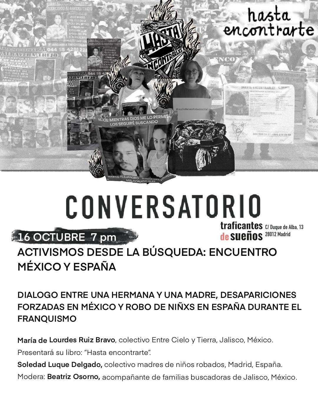 Con María de Lourdes Ruiz Bravo, colectivo “Entre cielo y tierra” Jalisco, Mx, presentará su libro “Hasta encontrarte”. Acompañan Soledad Luque, colectivo Niños Robados, Madrid; y Beatriz Osorno, acompañante de familias buscadoras en Jalisco, Mx.