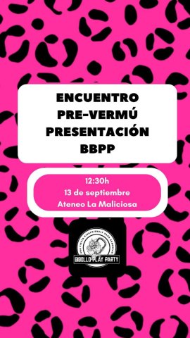 DI: Primera imagen: fondo de animal print rosa y negro. En un recuadro blanco se lee “Encuentro pre-vermú presentación BBPP. 12:30h. 13 septiembre. Ateneo La Maliciosa.” Segunda imagen: fondo de animal print rosa y negro. En recuadros blancos se leen los mensajes: ven a enterarte de todo, a resolver dudas sobre la fiesta, a conocer a otras bibollo, a fichar a tu crush y luego a tomar algo todes juntes.