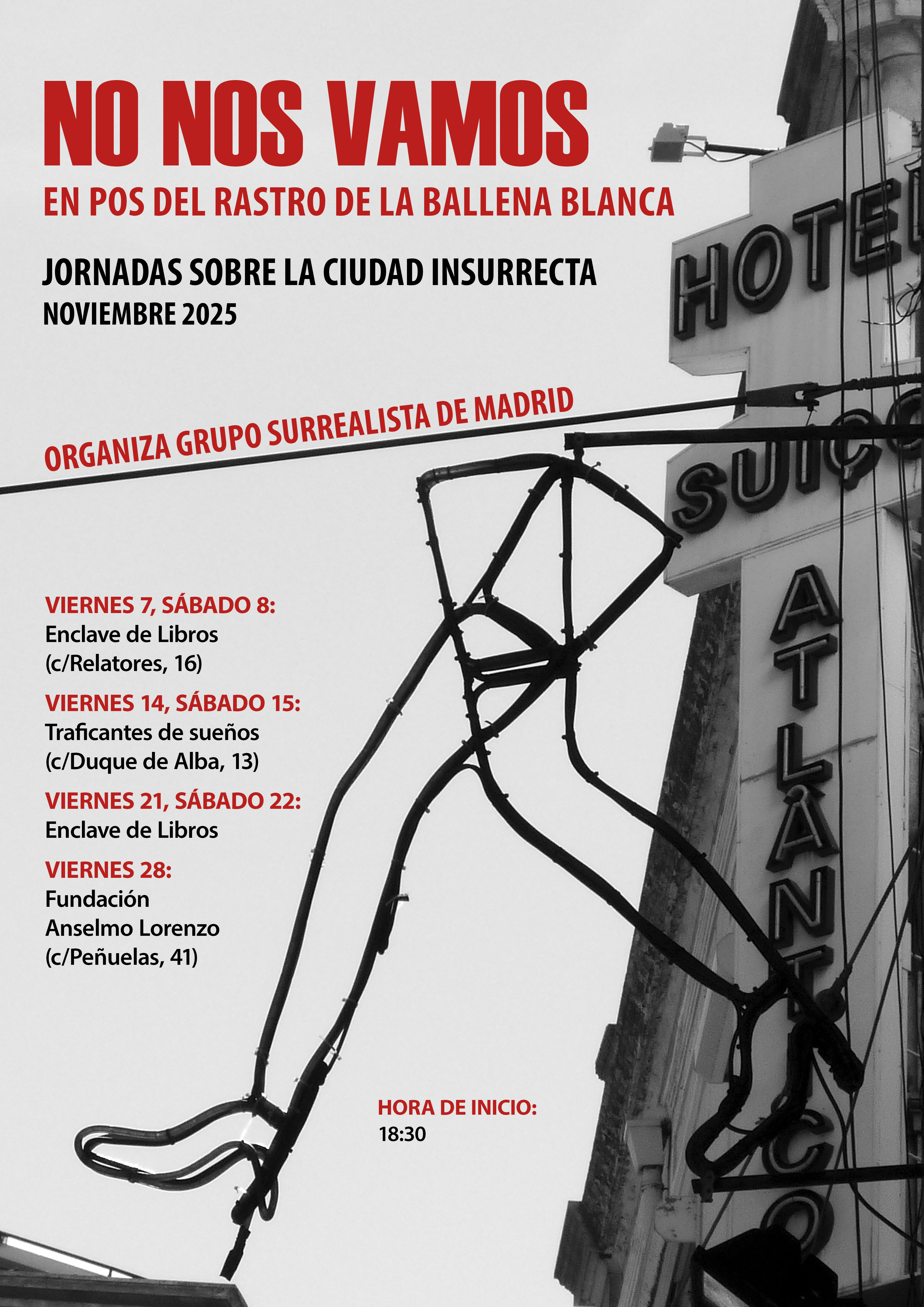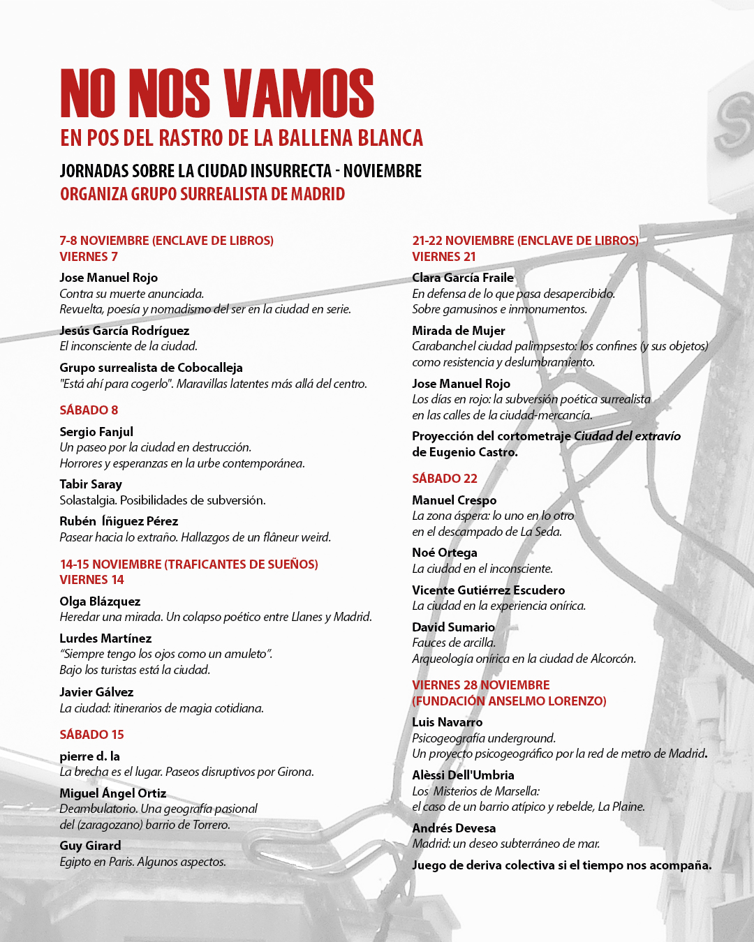 Por ello no basta la resistencia práctica a ultranza contra la megalópolis embargada por la publicidad, la vigilancia, los comportamientos estandarizados, la alergia al otro y lo otro, la adulteración de los barrios por el turismo y la gentrificación. No nos basta si en el fragor de la lucha se desdeñan las percepciones y vivencias de la psicogeografía, la deriva o el paseo surrealista, y todos aquellos testimonios y procedimientos que tal vez escapan, se desvían o transgreden las definiciones canónicas, que no se reconocen exactamente en ninguna etiqueta…y que ni falta les hace, en tanto que por sus propios medios convocan y encuentran el vértigo de lo maravilloso y la subversión poética que atraviesa la parte maldita de la ciudad: lo que todavía esconde, y estalla en la revuelta donde y cuando la ciudad se siente verdaderamente como propia.